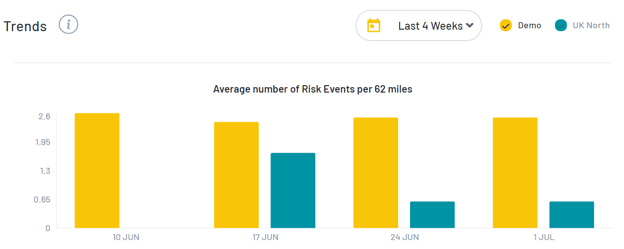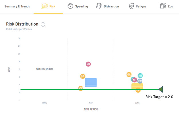 Here, we see that in May, as the Drivers were onboarding and familiarising with the Driver App, the best 25% of Drivers averaged a Risk Score of 3.0 Risk Events per 62 miles.