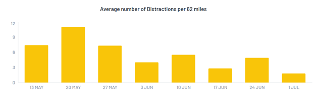 In June, due to in-app coaching and self-improvement, we see that the best 25% of Drivers averaged a better Risk score of 2.0 Risk Events per 62 miles.