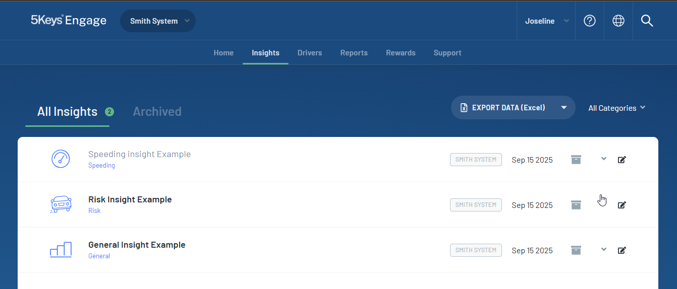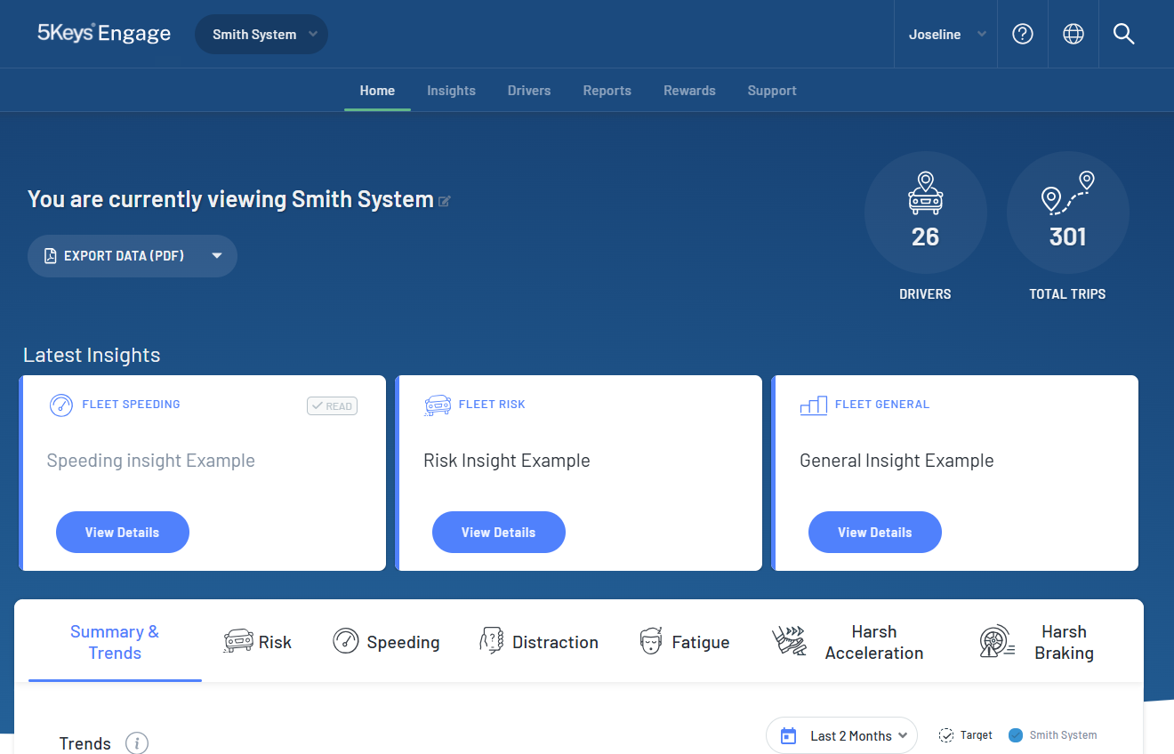 "Insights": press here to see all of the insights that have been generated for you on your fleet's risk trends and recommended driver interventions.