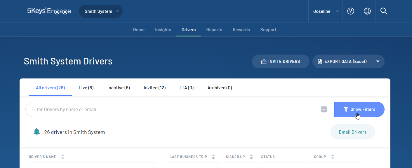 "Drivers": this section allows you to manage your driver estate (e.g. invite new drivers to the 5Keys Engage Driver App, archive drivers, assign groups (if applicable), and check driver status (e.g. Live vs. Inactive).