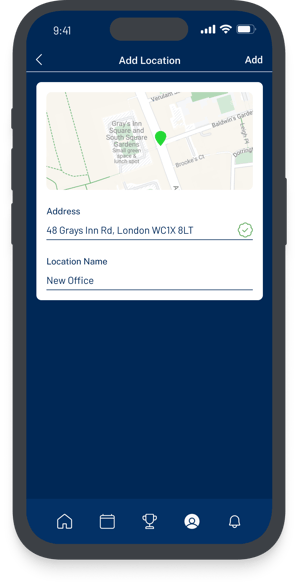 To add a new location, click Add location at the top of the screen. From here you can add a name for your location and the address. Start typing the location you would like to save in the search bar and once the map shows the correct location click confirm.